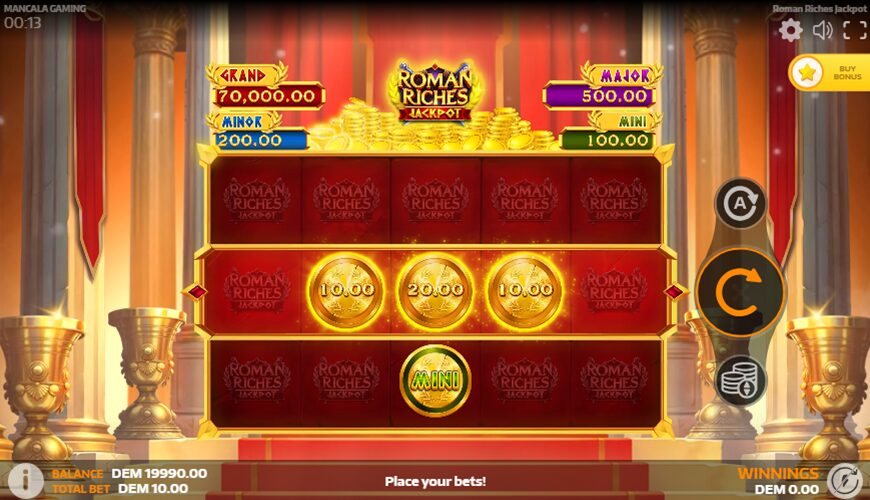Roman Riches Jackpot utilizes a unique 5×3 grid without traditional paylines. Instead, players find rewards through the Bonus Game and the Claim Win feature. the paytable consists of five main elements: three Jackpot symbols (Major, Minor, and Mini), a Sticky symbol, and a Coin symbol featuring random values.