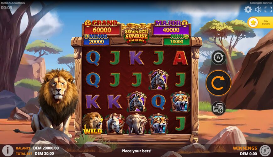 Familiarize yourself with the everyday life of the lion and other wild animals living in the famous Serengeti savanna. The Serengeti Sunrise slot by Mancala Gaming focuses on African wildlife. Visually, you’ll find high-quality elements—including an animated lion beside wooden reels, a sweeping view of the savanna, and detailed symbols on the grid. Naturally, the soundtrack perfectly reflects the theme.
